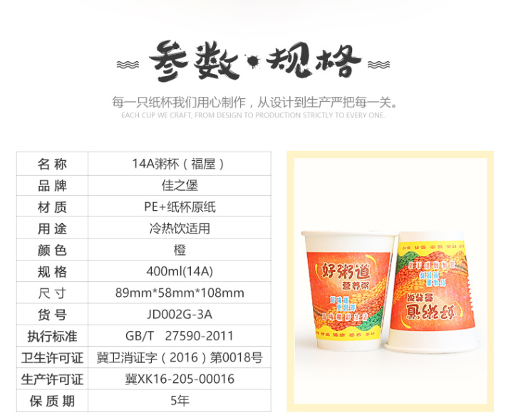 佳之堡14A粥杯(福屋)纸杯 400ml/50只 JD002G-3A